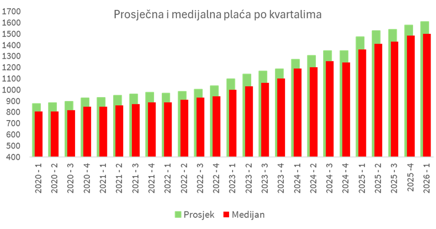 Prema podacima servisa MojaPlaća, kojim upravlja tvrtka Alma Career Croatia, a u čijem je sastavu i portal MojPosao, prosječna mjesečna neto plaća (s uračunatim dodacima) u prvom ovogodišnjem kvartalu iznosila je 1.609 eura. To je 2% više nego u prethodnom tromjesečju, i 9% više u odnosu na isto razdoblje prošle godine.