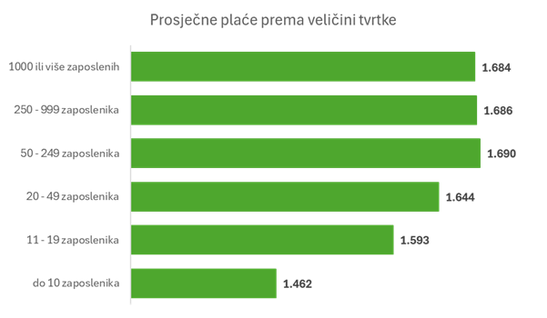 Na visinu plaće snažno utječe i veličina tvrtke. U najmanjim tvrtkama, s manje od 10 zaposlenih, prosječna plaća iznosi 1.462 eura, odnosno 9% ispod državnog prosjeka. Tvrtke s 10–19 zaposlenika nude nešto bolje primanje, 1.593 eura, što je 1% ispod prosjeka. Najviše plaće bilježe velike tvrtke, gdje zaposlenici u prosjeku zarađuju 1.680 eura neto (5% iznad prosjeka).