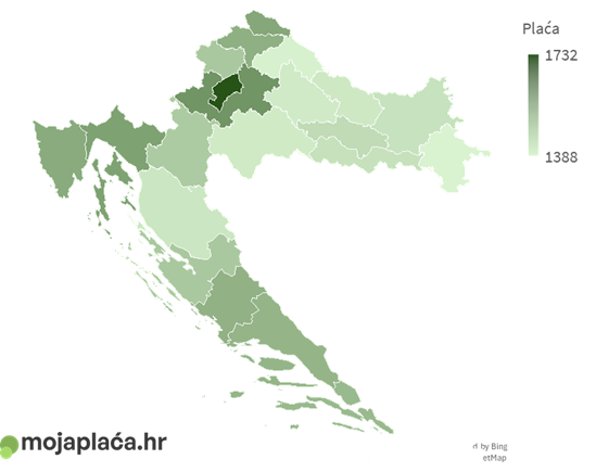 Najviša prosječna plaća zabilježena je u Gradu Zagrebu (8% iznad prosjeka) te iznosi 1.732 eura (medijan 1.600 eura).
