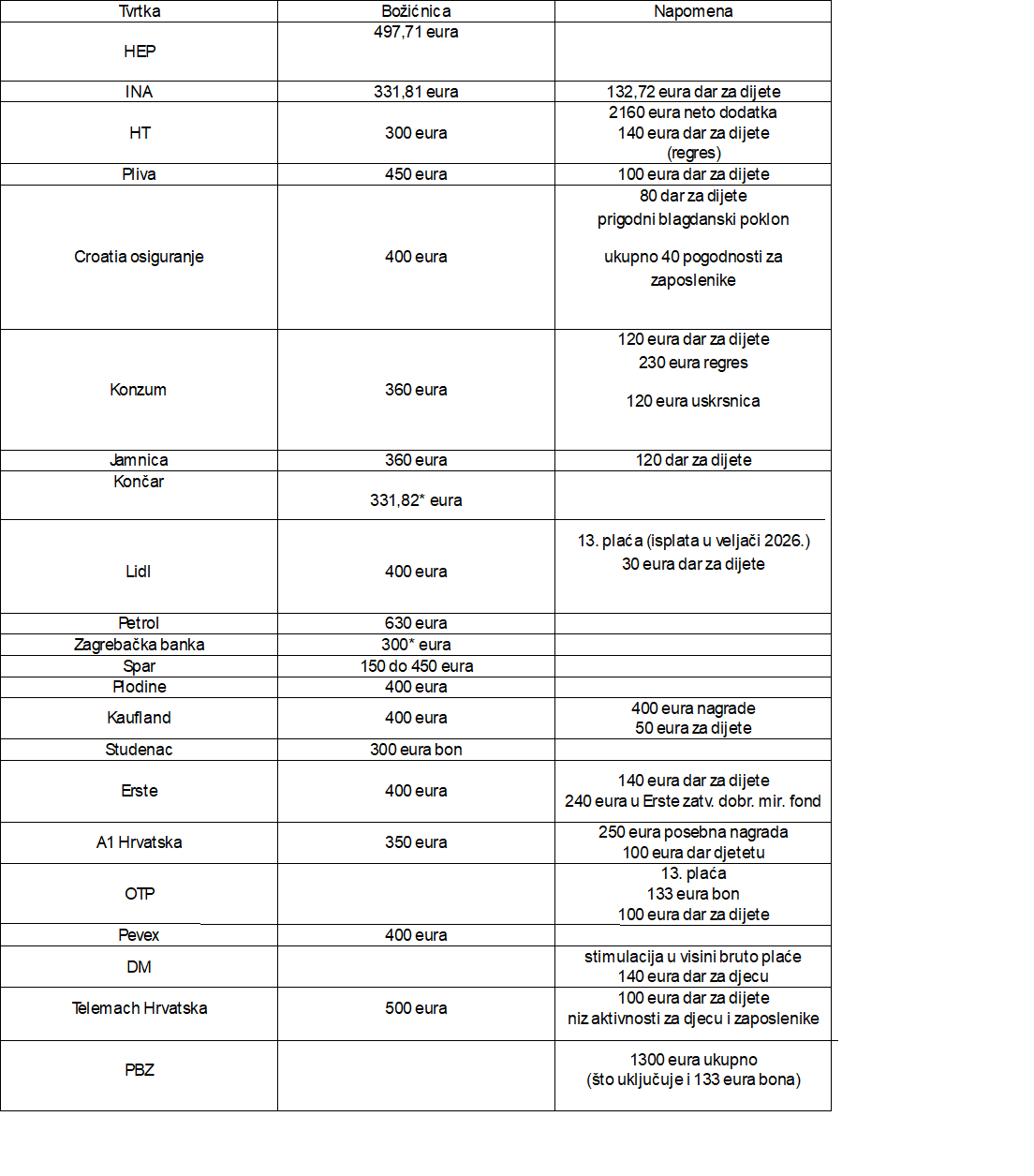 Zagrebačka banka, Končar i PPD nisu odgovorili konkretnim brojevima. Doduše, za Končar se na internetu može pronaći podatak o kolektivnom ugovoru iz 2023. godine, prema kojem je božićnica 331,82 eura. U jednom od ovogodišnjih oglasa za posao u Zabi, može se pronaći podatak o 300 eura božićnice u toj tvrtki. Podatke za ostale tvrtke nije bilo moguće naći na internetu.