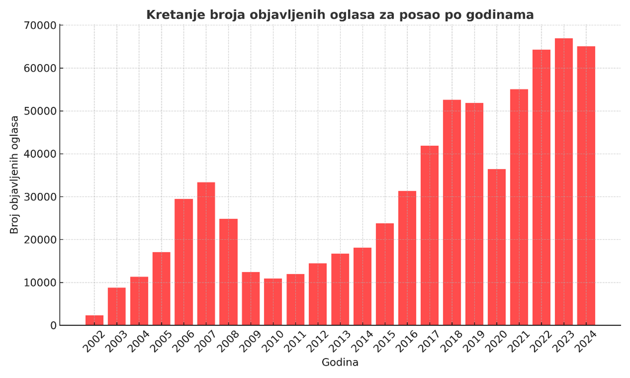 U godinama koje su uslijedile, potražnja za radnicima dosegla je nove rekorde: 64.000 oglasa u 2022., 67.000 u 2023. i 65.000 u 2024. godini.