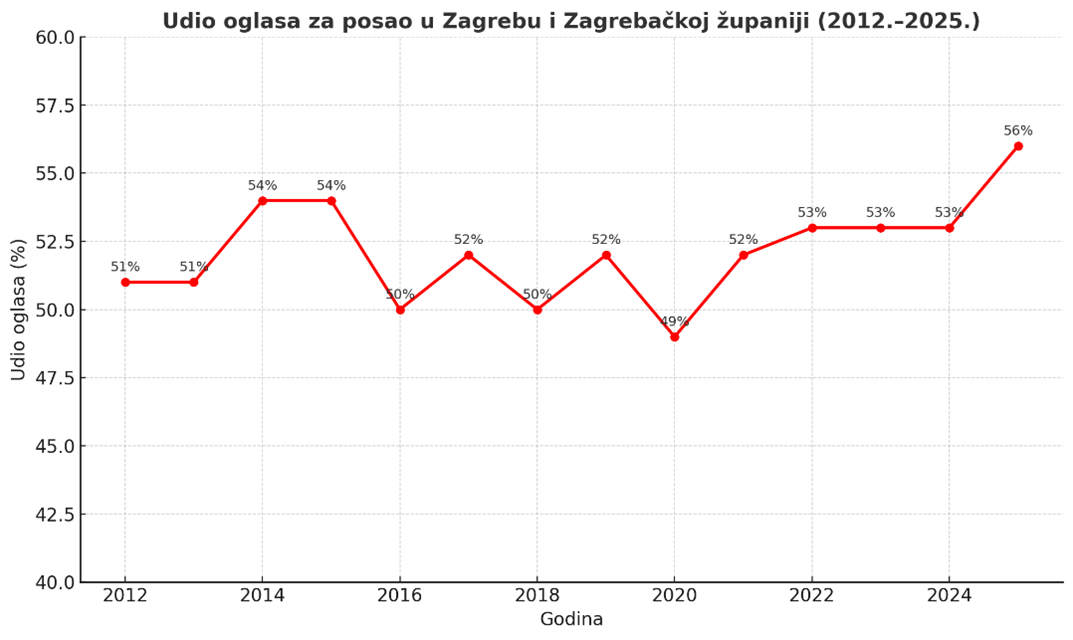 Tijekom većeg dijela promatranog razdoblja, udio Zagreba kretao se između 50 i 54 posto, uz tek jedan izuzetak – pandemijsku 2020. godinu, kada je zbog privremenog zastoja gospodarstva pao na 49%. U godinama koje su uslijedile, potražnja se ponovno povećala: od 2021. do 2024. udio se stabilizirao oko 52–53%, a u 2025. bilježi novi rast na 56%.