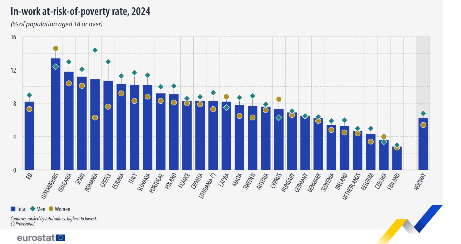 Posebno zabrinjava podatak da i zaposlenost ne jamči financijsku sigurnost: 8,2 % zaposlenih u EU bilo je u riziku od siromaštva 2024. godine. Najveći udio takvih radnika zabilježen je u Luksemburgu (13,4 %), a najmanji u Finskoj (2,8 %). Za Hrvatsku, iako konkretna brojka nije istaknuta u izvješću, Eurostatovi podaci iz prijašnjih godina pokazuju da se ta stopa kreće nešto ispod europskog prosjeka, što ukazuje na relativno manji broj “radno siromašnih”.