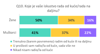 Rezultati istraživanja pokazuju da rad na daljinu trenutno češće koriste žene (50%) nego muškarci (41%). Istodobno, manji udio žena (16%) uopće nema iskustva s radom od kuće, dok je među muškarcima takvih 22%. Ovi podaci upućuju na to da žene češće koriste mogućnosti fleksibilnog rada – bilo zbog veće potrebe, bilo zbog dostupnijih prilika.