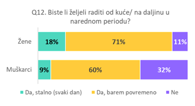 Želje zaposlenih dodatno naglašavaju ovaj trend. Dok svega jedna od deset žena ne želi raditi od kuće, među muškarcima takvih je čak trećina. Također, žene pokazuju veću spremnost za rad od kuće u oba scenarija, i kada je riječ o svakodnevnom radu (18% žena naspram 9% muškaraca), i kada se radi o povremenom radu na daljinu (71% žena naspram 60% muškaraca).