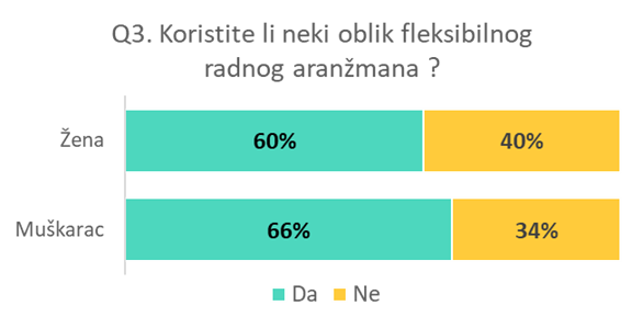 Rezultati pokazuju da 66 posto muškaraca i 60 posto žena koristi neki oblik fleksibilnog rada, primjerice klizno radno vrijeme, rad od kuće ili odabir početka i završetka radnog dana.