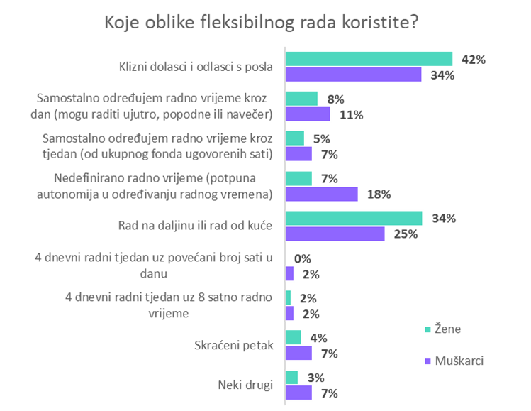 Prema istraživanju, ženama su najvažniji oblici fleksibilnosti oni koji im olakšavaju usklađivanje posla i privatnih obaveza. Najpopularniji među njima su klizni dolasci i odlasci na posao, koje koristi 42 posto žena, u usporedbi s 34 posto muškaraca. Slično je i s radom na daljinu: trećina žena radi od kuće barem dio vremena, dok to čini četvrtina muškaraca.