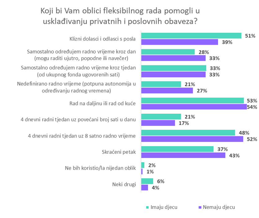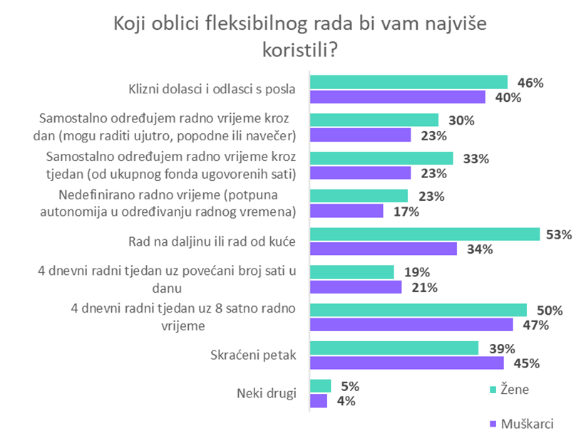 Najpoželjniji su oblici fleksibilnosti u radu oni koji omogućuju lakšu svakodnevnu organizaciju. Klizni dolasci i odlasci s posla te rad na daljinu ili od kuće uvjerljivo su na vrhu liste i kod žena i kod muškaraca. Ipak, žene ih preferiraju u nešto većoj mjeri (46 posto žena i 40 posto muškaraca), dok 53 posto žena želi opciju rada na daljinu (u odnosu na 34 posto muškaraca).