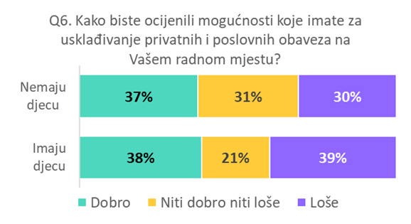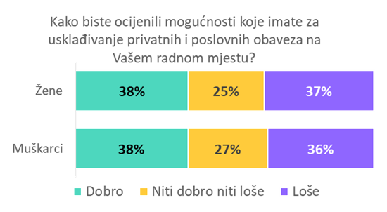 Više od trećine ispitanika smatra da nema dobre mogućnosti za ravnotežu između posla i privatnog života, bez obzira na spol. Otprilike jednako toliko njih procjenjuje da ipak imaju solidne uvjete za usklađivanje obaveza, dok se ostatak nalazi negdje u sredini te nisu niti zadovoljni, niti nezadovoljni.