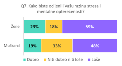 S druge strane, manji udio ispitanika iz obje skupine smatra da im je stanje dobro – tek 19% muškaraca i 23% žena ocijenilo je svoju razinu stresa niskom.