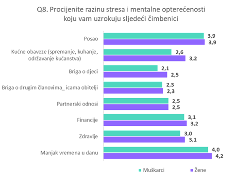 No, izvan radnog mjesta stvari se dodatno kompliciraju. Kućanske obaveze predstavljaju veći izvor stresa za žene (3,2) nego za muškarce (2,6), što ukazuje da se teret svakodnevnog kućnog rada još uvijek neravnomjerno raspoređuje. Sličan trend vidi se i kod brige o djeci, koja ženama nosi više stresa (2,5) nego muškarcima (2,1).