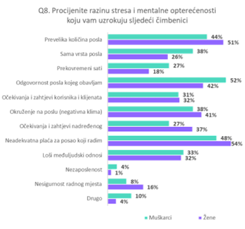 Ipak, žene češće osjećaju teret tih problema: 51% ispitanica navodi da ih opterećuje previše posla, a 54% ističe nezadovoljstvo plaćom. Kod muškaraca su ti udjeli nešto niži – 44% i 48%.