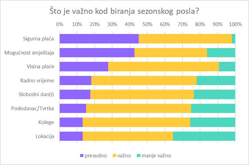 Sezonski radnici često dolaze iz različitih dijelova Hrvatske, ali i iz inozemstva, pa ne iznenađuje da su im sigurna plaća (46%) i osiguran smještaj (43%) presudni faktori prilikom odabira poslodavca.