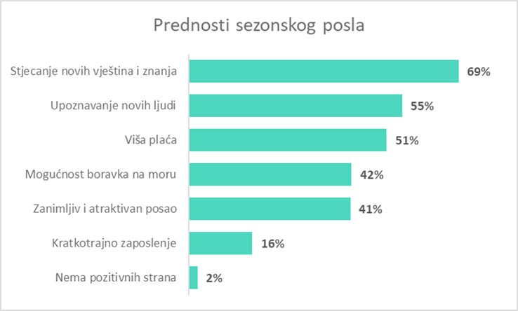 Kao i prethodnih godina, najveći broj ispitanika (69%) ističe stjecanje novih znanja i vještina kao njegovu najveću prednost. Više od polovice (55%) naglašava i priliku za upoznavanje novih ljudi, dok 51% smatra kako sezonski rad donosi i financijsku korist u vidu veće plaće u odnosu na cjelogodišnje zaposlenje.