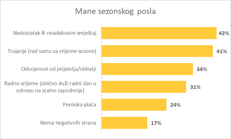 S obzirom na to da sezonski rad često znači i odlazak u drugi grad ili regiju, značajan dio ispitanika (34%) ističe i odvojenost od obitelji i prijatelja kao važan minus. Uz to, sezonski poslovi nerijetko podrazumijevaju i znatno intenzivniji tempo rada nego što je to slučaj kod cjelogodišnjeg zaposlenja, što problematičnim smatra 31% ispitanika.