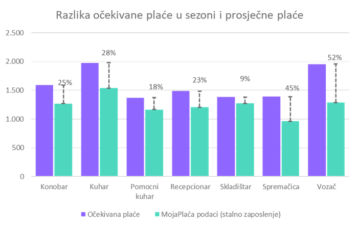 Razlike su posebno vidljive po zanimanjima. Konobari tako za sezonski rad očekuju oko 1.590 eura, što je čak 25% više od njihove prosječne plaće 'izvan sezone', koja je prema podacima servisa MojaPlaća u 2025. iznosila 1.270 eura.