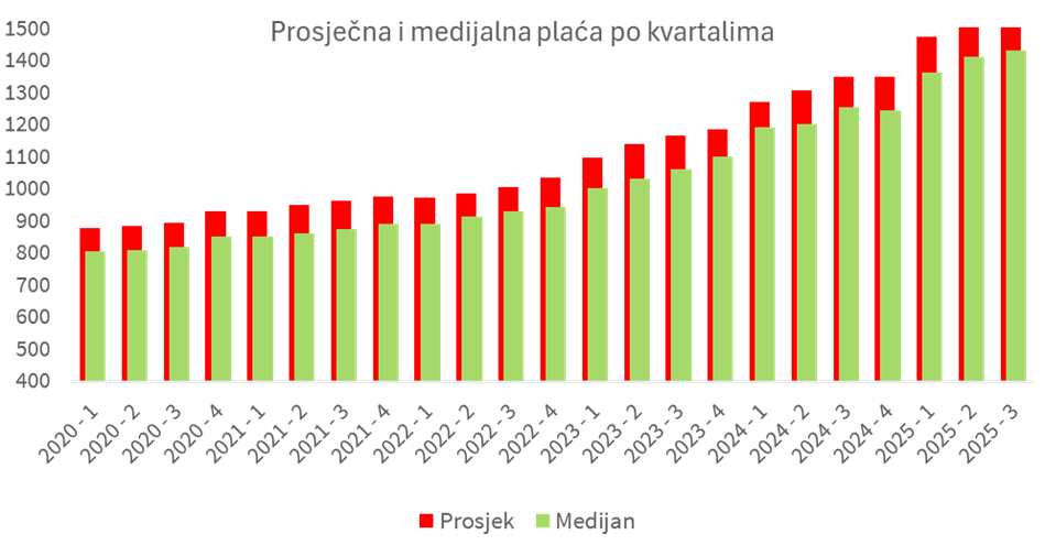 I medijalna je plaća, kao i prosječna, u odnosu na prethodni kvartal porasla za 1%, dok je na godišnjoj razini veća za 14%.