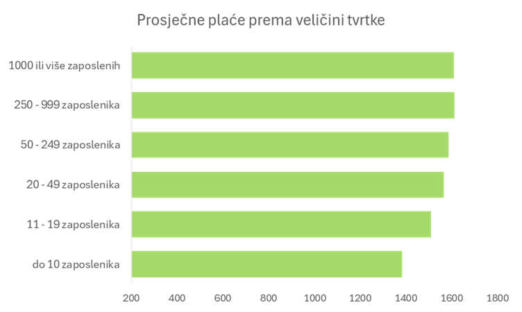 Na visinu plaće snažno utječe i veličina tvrtke. U najmanjim tvrtkama, s manje od 10 zaposlenih, prosječna plaća iznosi 1.383 eura, odnosno 10% ispod državnog prosjeka. Tvrtke s 10–19 zaposlenika nude nešto bolje primanje, 1.510 eura, što je 2% ispod prosjeka. Najviše plaće bilježe velike tvrtke, gdje zaposlenici u prosjeku zarađuju 1.611 eura neto (5% iznad prosjeka), a na godišnjoj razini to predstavlja rast od 22%.