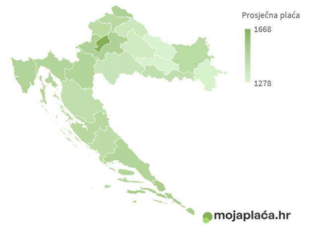 Najniže plaće i dalje su na istoku zemlje: u Vukovarsko-srijemskoj (-16%, s plaćom 1.292 eura), Požeško - slavonskoj (-16% ispod prosjeka, odnosno 1.285 eura) te Virovitičko-podravskoj županiji (-17% ispod prosjeka, odnosno 1.278 eura).